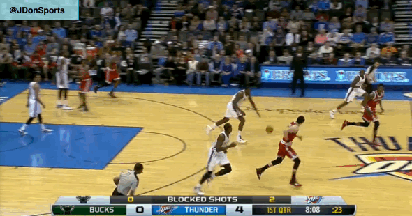 The floater also keeps Perkins free from thinking. It’s similar to what Seth Partnow at Where Offense Happens wrote about Harrison Barnes a few weeks ago, for example. Keep it simple, and Perk does when he goes with the floater. It means he doesn’t pump fake or back his defender down with a series of dribbles, but takes that silky, silky, silky smooth shot before the defense adjusts towards the paint. Like mentioned before, the quick floater by Perkins also gives Ibaka a greater chance at an offensive rebound since there’s one less opponent in the paint.