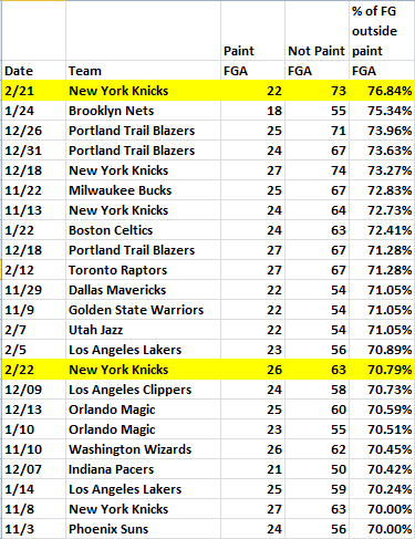 Teams on average take 52.7 percent of their shots outside the paint. I’ll have another blog post sharing a table of that, among other things. For now, here’s where the Knicks’ last two games fit in with the 21 other instances of excessive perimeter shooting: