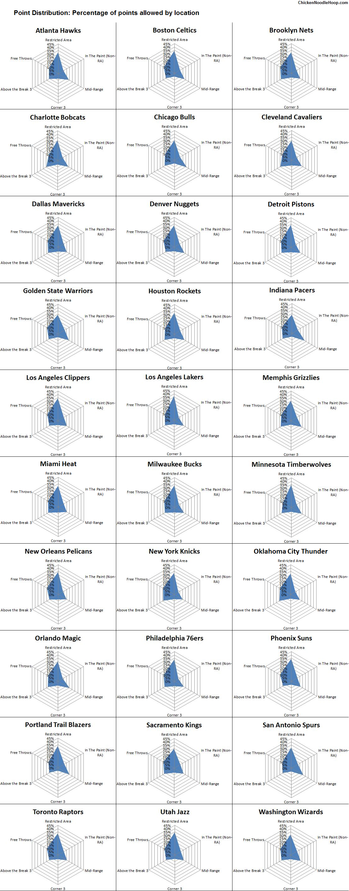 Similar to what I mentioned in the first post, the graphs for the best and worst offenses and defenses just aren’t the same as one another. Take the Heat, Clippers, and Mavericks as the top three offenses, for example. Thanks to LeBron James, Dwyane Wade and Chris Bosh, Miami scores a ton of their points in the restricted area — 36.5 percent, to be exact and fourth-highest in the league. Meanwhile, the Clippers are near the middle in point distribution from a few locations, but with the help of Blake Griffin they get just under one-fifth of their points from the free throw line. Dallas, with a nightmare of a scorer to gameplan for in Dirk Nowitzki, is weirdly balanced in all locations as they don’t appear too high or low in any of them.