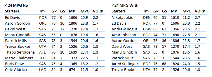 Not a bad group of players. When looking at VORP, the winner here is Nikola Jokic. When filtering out starters, the top player is Ed Davis. Both tables feature players who are solid but for health, age, or depth reasons have not cleared the 24-minute mark. Of course, this is only one statistic to measure by, but I’ve enjoyed fiddling around with it lately and it sounds cool, the latter reason about as good of a reason to judge a player by as points per game. Maybe. (This often seems so true for whenever Win Shares makes an appearance. It’s a darn good name for a stat.)