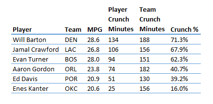 Dividing a player’s crunch time minutes (up or down by five or less points with five or less minutes remaining in a game) by a team’s total crunch time minutes is easy to find with players who have played in every game, but it’s kind of a hassle, at least for me, to calculate how many minutes a player like Manu Ginobili who get banged up or have frequent DNP-NAPs. So for this, I only took six eligible players who are at least something of a contender for the Sixth Man of the Year, whether it feels right or not. I also let the 24-minute filter slide because there are only so many players who have played close to 100 percent of the season so far, and only so many who happen to play less than half of the game and/or start less than half of their games. Crunch minutes are from NBA.com: