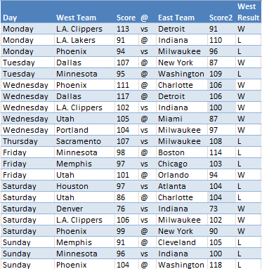 So by win-loss and point differential, Week 11 was pretty average with the West going 13-10 with a margin of victory of +4.61. Below are the non-conference summaries: