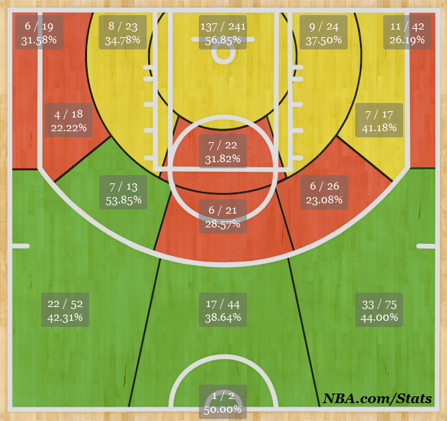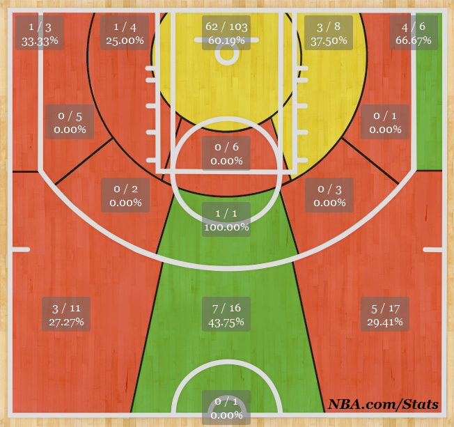 Going forward, Davis and Jordan look like the best bets to block more shots than a team. As mentioned before, Hibbert has understandably looked to use verticality to his advantage rather than get a hand on the ball and risk foul trouble. Davis and Jordan are far more mobile and freakishly athletic to recover from situations where they’re either beat or hair late on a rotation to a driving guard. They also play in that 35-minute range that allows them more opportunities to tally blocks.
