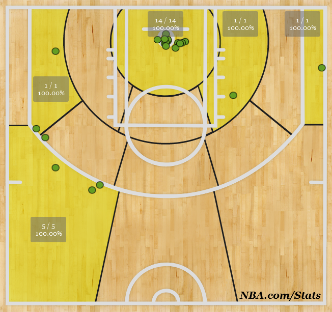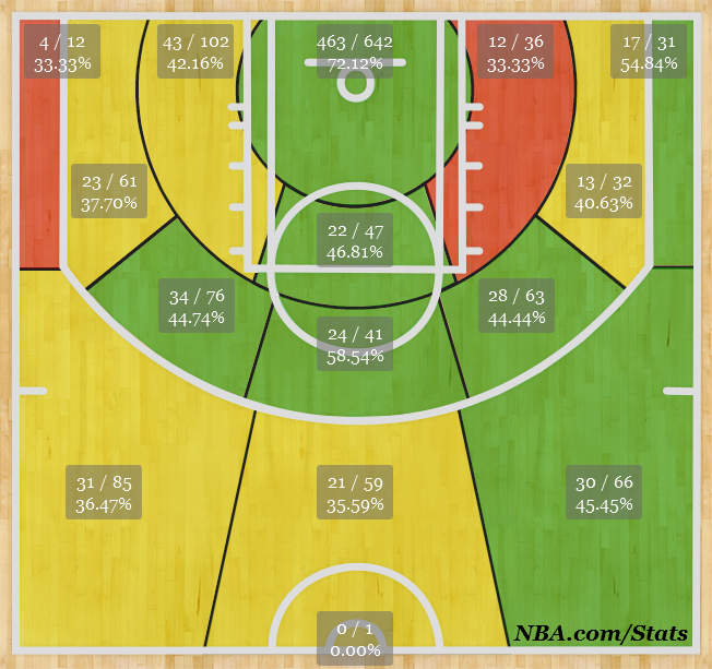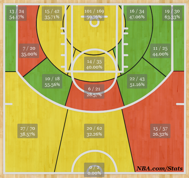 Meanwhile, Hibbert was also just coming down to earth after recording 4.3 blocks per game over 30 minutes in his first 13 games. His block percentage while on the court, 10.2, had only been done over a full season six times with five coming from Manute Bol, and the most minutes played during any of those seasons was 26.1 during Bol’s 1986 campaign. Naturally, Hibbert’s block totals started to average out. He only had seven over his next six games and just two combined against the block-prone Bobcats and Timberwolves (Hibbert was also blockless Wednesday night in his second matchup against Minnesota). His block percentage during that six-game span was 2.7, right around the same percentage Paul Millsap and Chris Bosh have recorded this season. That’s not bad, but it’s also not even half the frequency Hibbert logged last season.