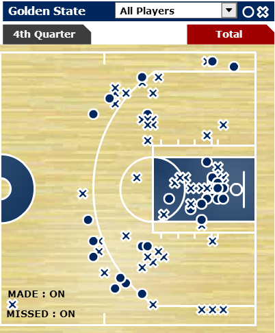 Eight of their 12 threes came from Stephen Curry and Klay Thompson. Not seen in that shot chart was Andrew Bogut‘s 20 rebounds.