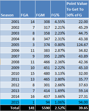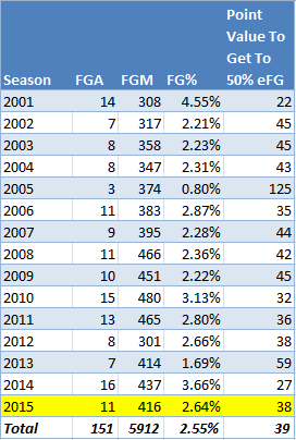 I suppose I could’ve filtered this to see pitching numbers from the seventh inning on, or whenever a pinch hitter becomes logical, but I don’t want to look this up and I don’t know how to. However, in an effort to spread heave awareness (STOP RUNNING THE CLOCK OUT TO PRESERVE YOUR BASIC STATS WE LOOK PAST ANYWAY BECAUSE THERE ARE TONS OF DIFFERENT WAYS WE CAN SEPARATE THESE LOW PERCENTAGE SHOTS OR ANY OTHER KIND OF SHOT FROM THE REST) just remember that over the last 15 years, the chances of making a shot from 45+ feet in the NBA has been about as likely as a pitcher stepping up to the plate and hitting a double, triple, or home run.