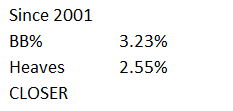 Much closer, pitchers walking are 10.4 times less likely than a strikeout but not high enough to be compared to made heaves. That’s even if we took out all two of the intentional walks by Chris Hatcher and Brooks Kieschnick. Kevin Jarvis is the current leader in walk rate at 9.6 percent.