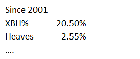 I don’t follow baseball closely, but not only are these percentages close enough to each other, the outcome we just compared to NBA heaves makes enough sense to be the baseball version, right? Maybe this outcome would be way too high, though, if pitchers were told to swing away more often than move runners along. Regardless, Owings, also the leader in batting average, takes the cake here with 11.4 percent of his plate appearances leading to extra base hits.