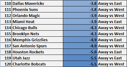 So below is what I looked at. I find Oklahoma City inconsistent health-wise to the point I left them off all splits save for conference-wide ones. That sounds crazy but I separated the West into the top eight and bottom seven seeds, but the Thunder were so weird to me that I left them off both. Like, when healthy they’re a playoff team, so it’s not totally fair to put them in the bottom seven where I wanted to see how the best and worst of the East performs against the mehhhh section of the West. This all might sound ridiculous and I apologize. If I run similar splits at the end of the season I’ll include the Thunder. Or just remove the top 8 teams and see if anybody notices.